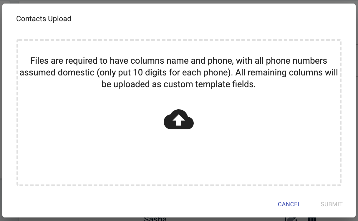 Then you will see the upload window pop up and you can drag and drop your file, or click on the cloud icon to select your file. If you don’t know how to properly format your file for a CSV upload, read our article on How to Format a Contact List.