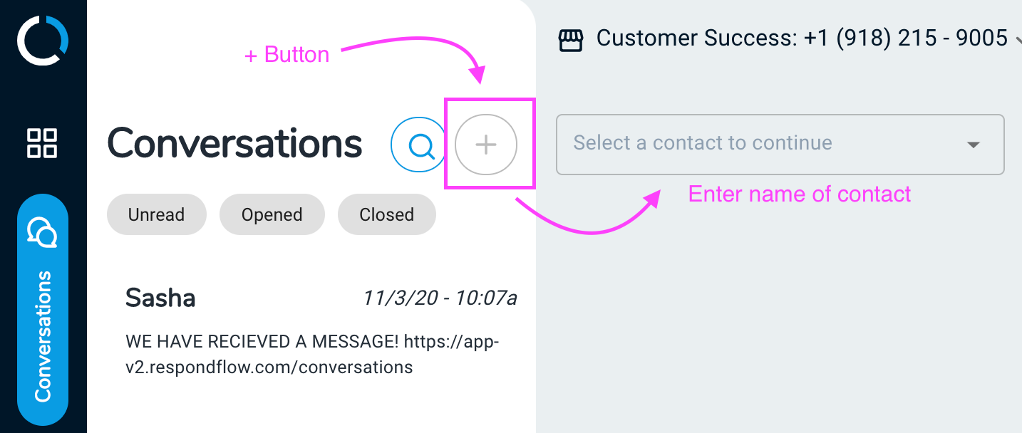 2) Navigate to the conversations page and hit the "+" button and enter the person's name.